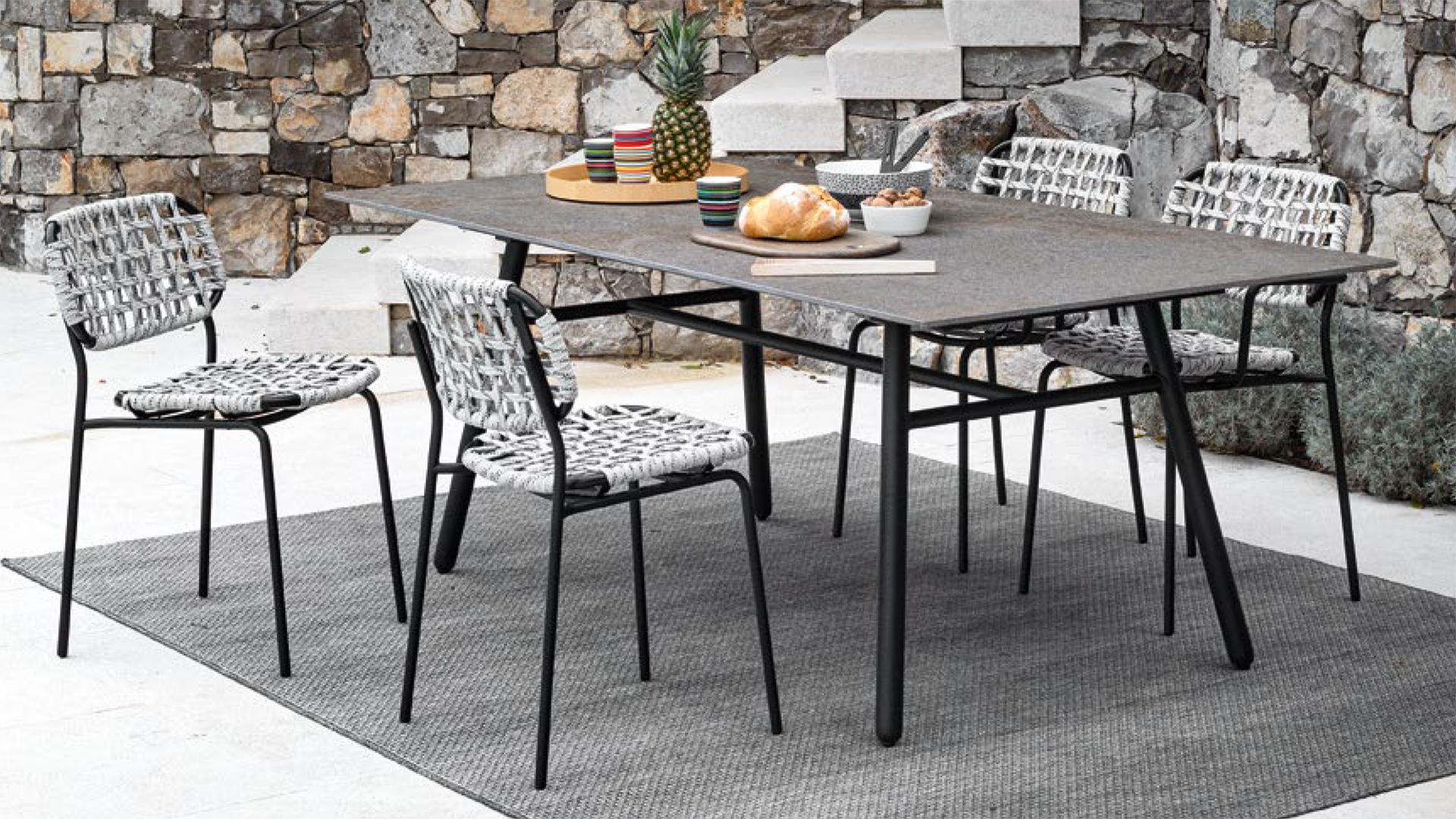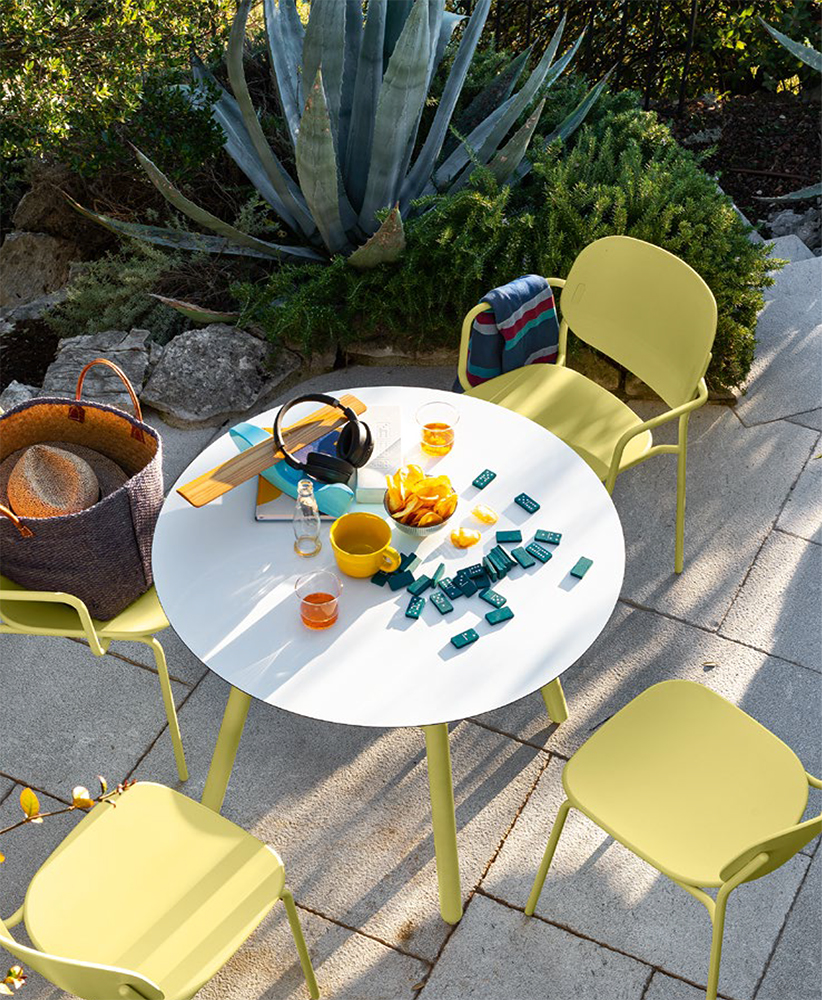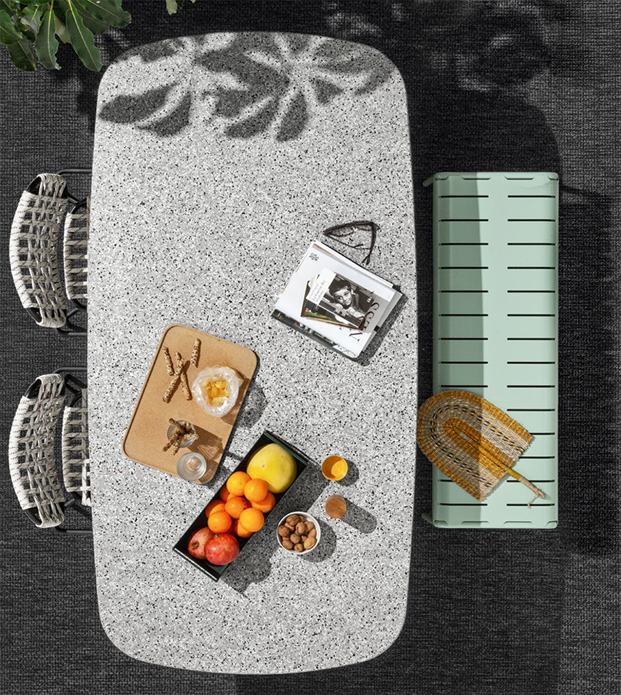 The non-extending Yo! table has an aluminium base which has been treated and coated for outdoor use. You can choose between an HPL top or a ceramic top enhanced with In-side technology, with a tactile marled finish reminiscent of natural stones to create an unbroken effect between the surface and the edge. They are easy to clean and do not require maintenance despite the passage of time. The ceramic surface has been specially designed to prevent mould and mildew from growing. Yo! also has a green soul - it is available with an Eco-stone top made from post-consumer recycled composite materials, which can be recycled again at the end of its life.