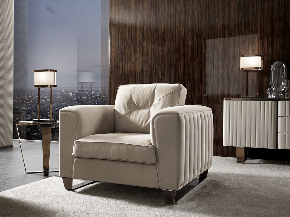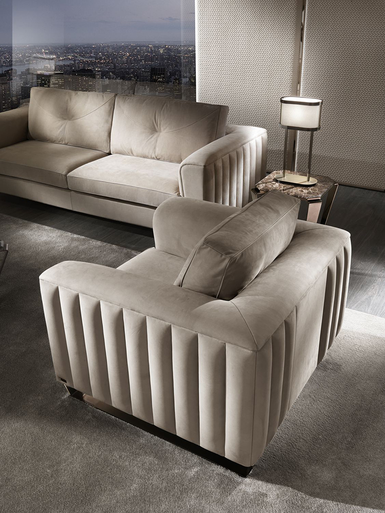 The Beverly chair has lush volume and simple geometric shapes. A distinctive detail is a vertical straight screed, which trimmed the sides of the chair.