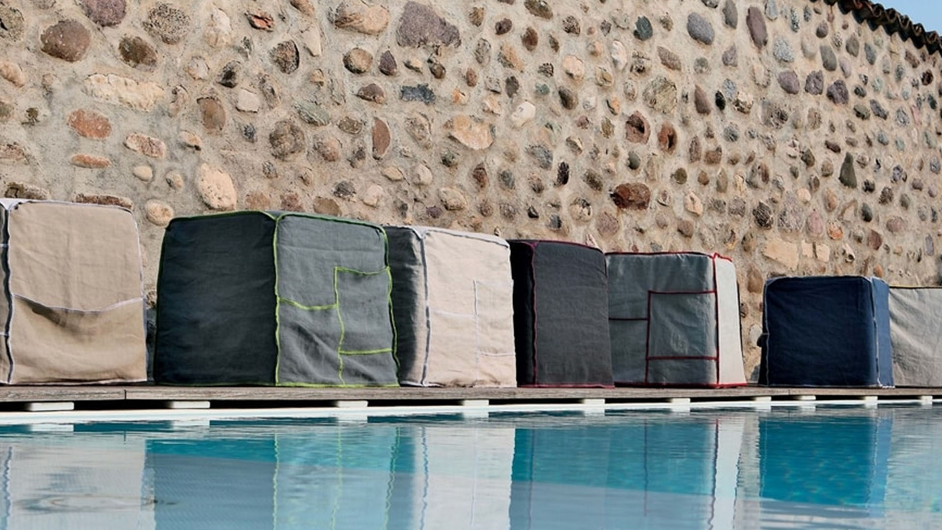 Pouf upholstered in fabric with a pocket and contrasting stitching.
