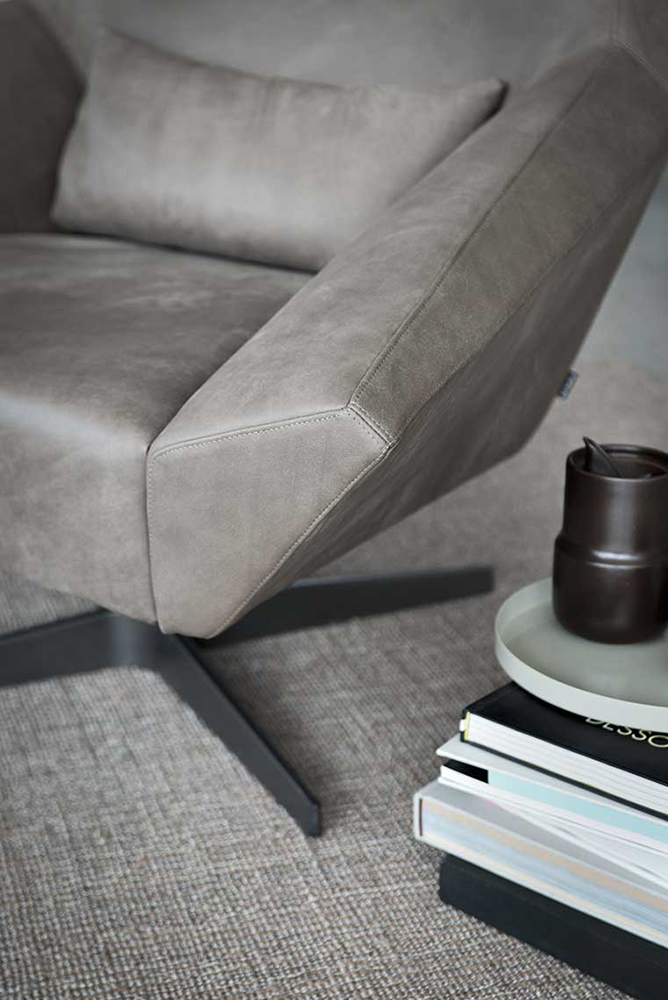 Olivia is a padded armchair and footstool pair with a metal swivel base. Olivia’s design is open and features a hint of contortion to show how it can be suited to the most varied of positions.