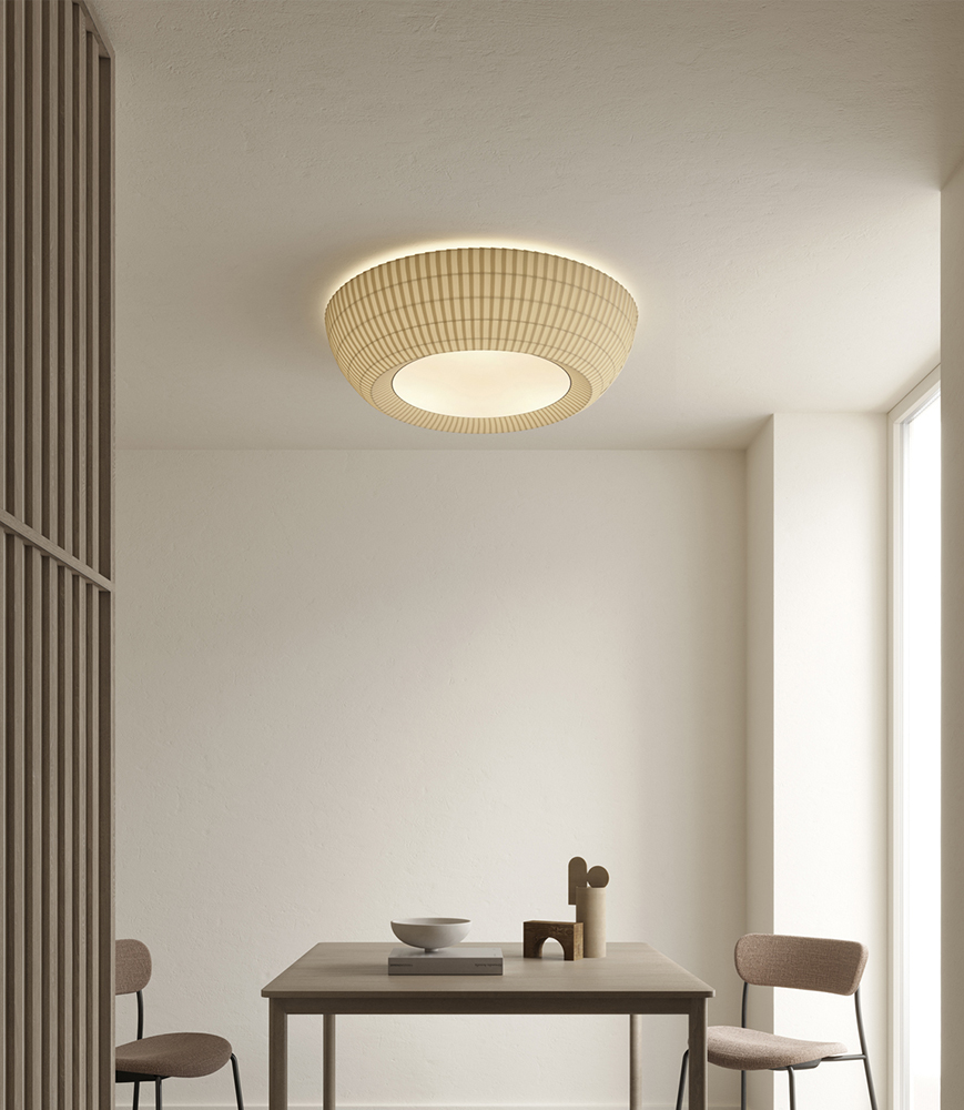 Bell-ի առաստաղի տարբերակը կախովի էսթետիկայի շարունակությունն է։ Գործվածքի տված թեթևությունը, բազմաչափությունն ու գունային տատանումները մնում են անփոփոխ։ Այս տարբերակի հարմարվողականությունը տարբեր համատեքստերին ապահովված է ավելի փոքր չափերով և գծերի պարզությամբ: Նրա պոնժե գործվածքը, բացի հրակայուն լինելուց, Bell-ին դարձնում է ակուստիկ լամպ իր հյուսվածքի շնորհիվ: Դրա համարժեք ձայնային կլանման տարածքը կազմում է մինչև 1,86, ինչը թույլ է տալիս Bell-ին նվազեցնել աղմուկը 37%-ով: