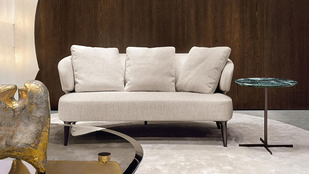 Բազմոցն ունի նուրբ մեջք, որն համադրվում է բռնակների գծերին. այն բարձրացված է հատակից՝ անագի գույնի ձուլածո ալյումինե ոտքերի վրա, որոնք ընդգծում են նրա նուրբ դիզայնի հատկությունները:
