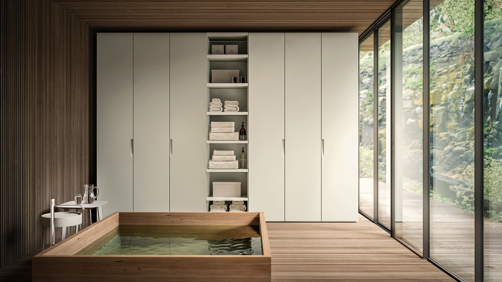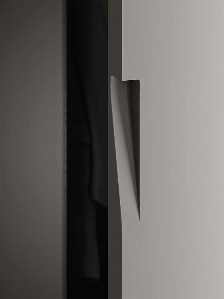 Մեծ խնամքով ընտրված որակյալ նյութերից Silver պահարանը՝ կախովի դռնով և ներկառուցված բռնակով համադրում է գործնականությունն ու էսթետիկան՝ առավելագույնս օգտագործելով տարածքի ձևն ու չափը: