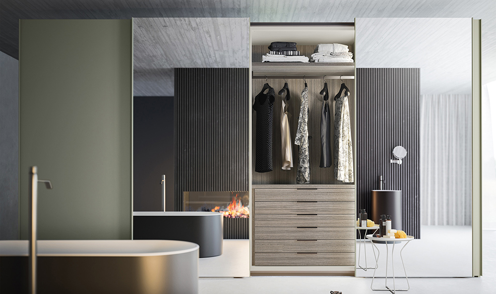 Гардероб Vision с раздвижной дверью и встроенной жалюзи является незаменимым аксессуаром в респектабельной комнате: он дополняет комнату, предназначенную для отдыха, оптимизируя пространство и украшая его.