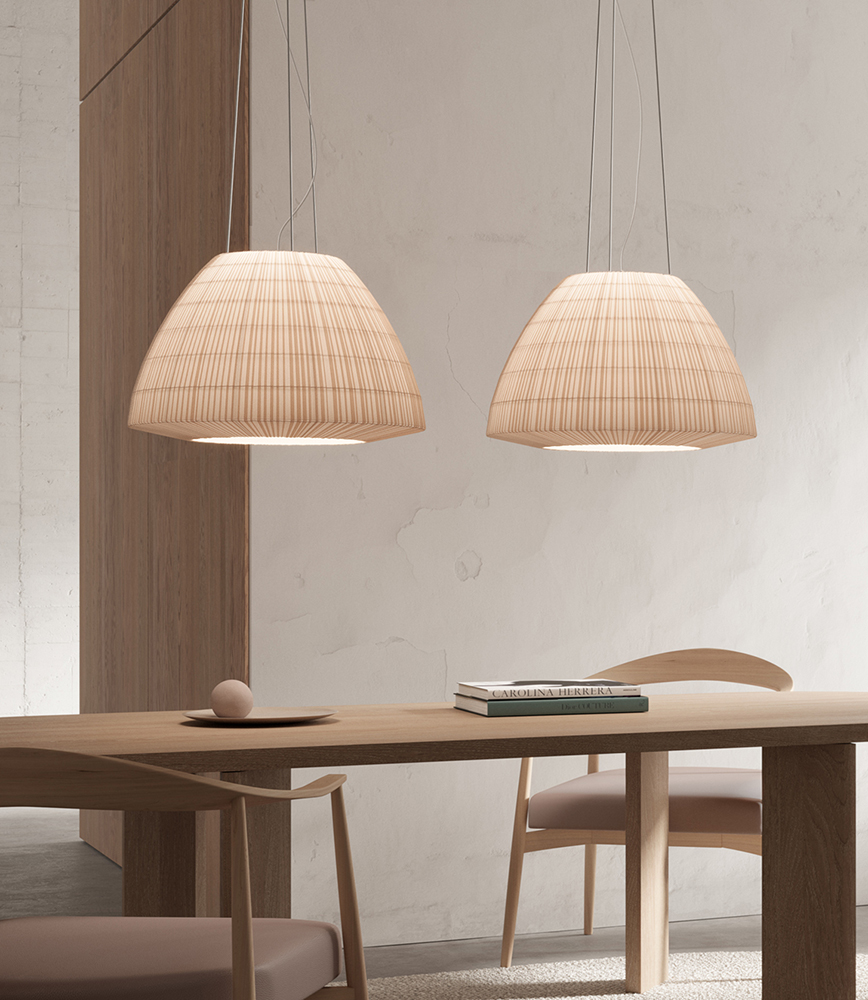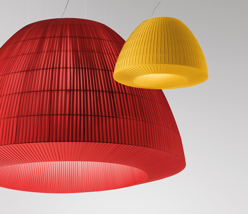 Bell в своей подвесной версии оригинально интерпретирует форму купола. Несмотря на значительный объем, мягкие линии и легкость ткани делают Bell лампой, которая не отягощает окружающую среду. Благодаря своим цветовым и размерным вариациям, Bell подходит для разных стилей и проектов, персонализируя любое пространство. Bell сочетает в себе важную эстетическую индивидуальность, отличные световые характеристики и акустические свойства. Его ткань понже, благодаря своей текстуре, является одновременно огнестойкой и акустической. Его эквивалентная площадь звукопоглощения до 4,63 позволяет Bell снизить уровень шума на 59%.