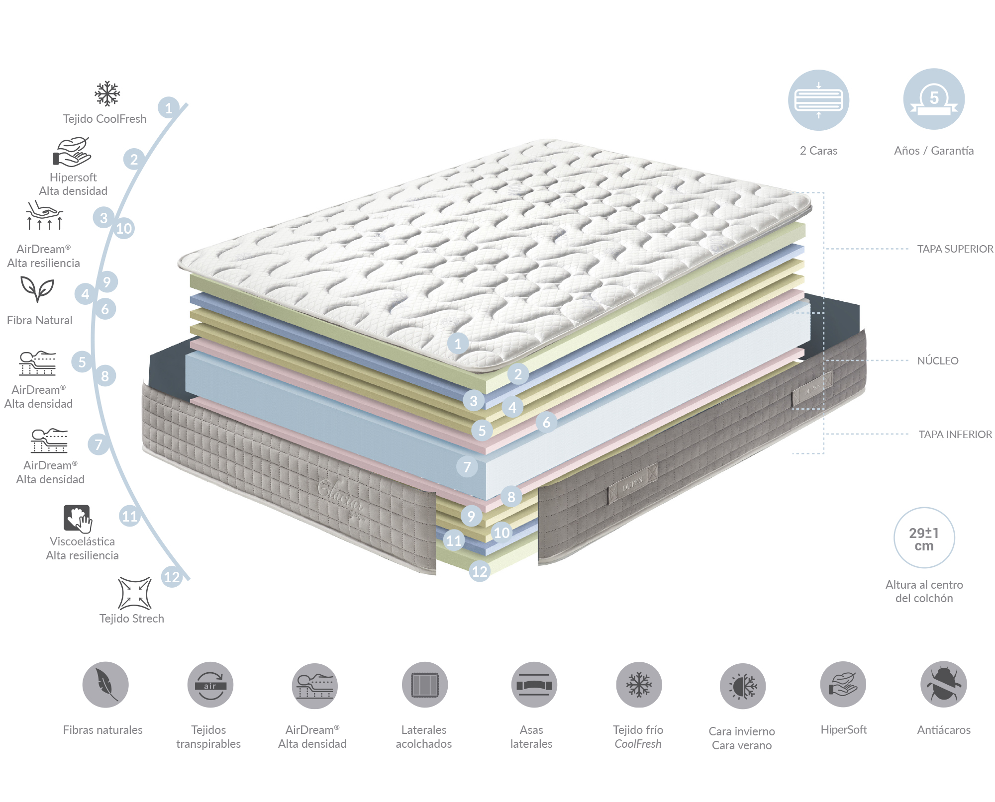 Матрас Glaciar - это матрас новой технологии, особенно удобный для использования в летние месяцы благодаря ткани с охлаждающим эффектом, которая помогает регулировать температуру тела. Зимняя сторона матраса изготовлена из пены с эффектом памяти высокой плотности, которая равномерно распределяет температуру тела, создавая более теплое и комфортное  в холодные месяцы.