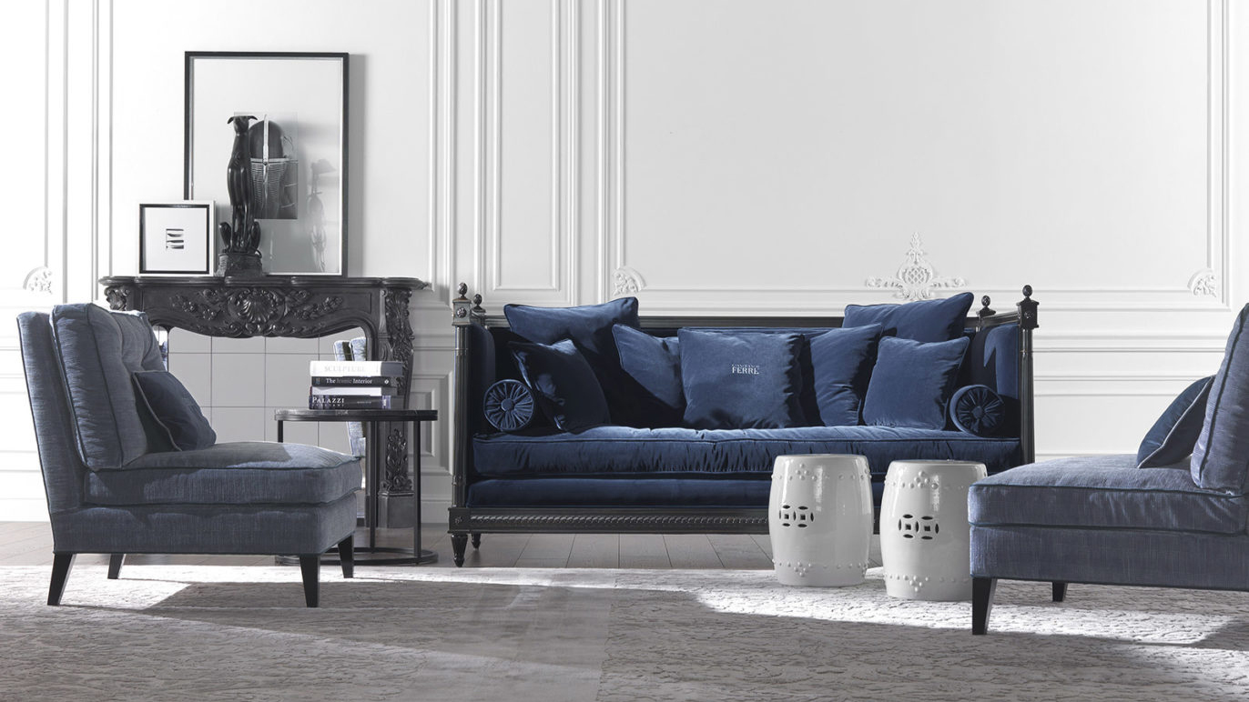 Царственный и роскошный диван King имеет резную конструкцию в классическом стиле. Обивка из синего бархата и извилистые и пленительные формы подушек делают комплект оригинальным и привлекательным, что делает его идеальным предметом мебели, который доминирует и характеризует обстановку, в которой он находится.