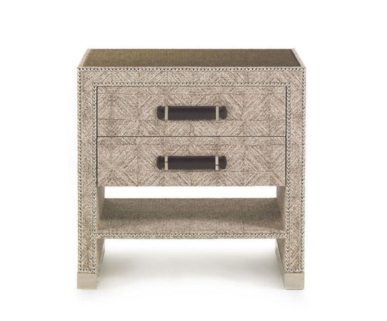 Структура в многослойном тополе. Внешняя сторона обтянута тканью и украшена декоративными металлическими гвоздиками. 2 ящика внутри покрыты микрофиброй. Ручки кожаные. Столешница – стекло. Ножки стальные.
