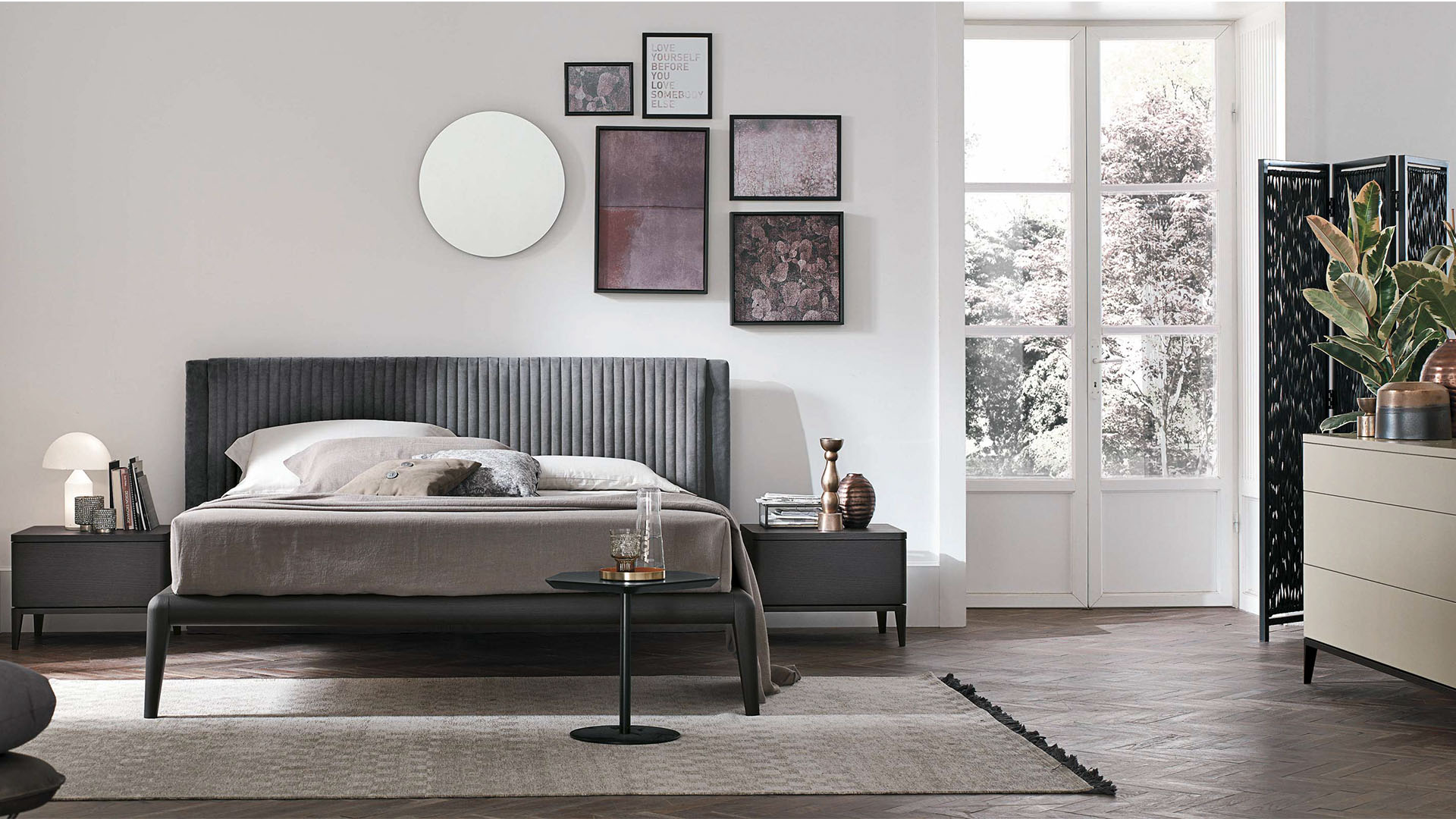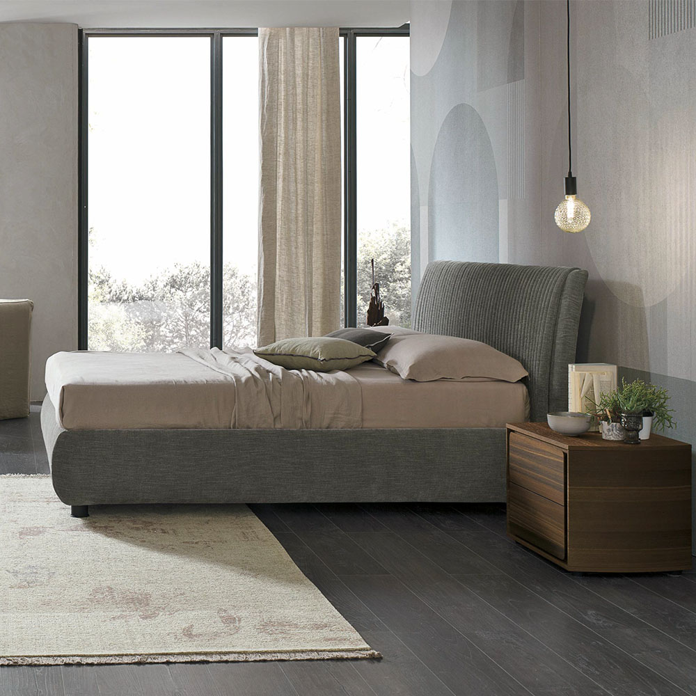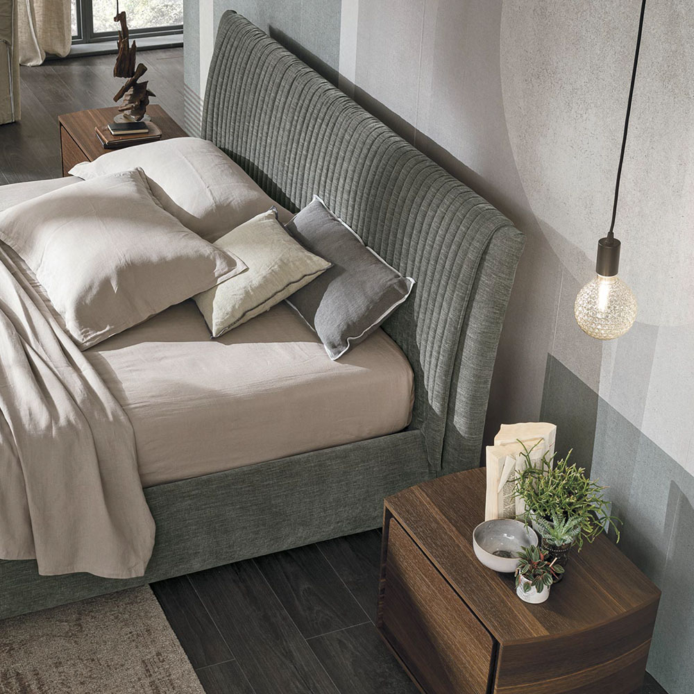Мягкое изголовье украшено оригинальными декоративными вертикальными швами: эта кровать сочетает в себе необычную ребристость изголовья с тщательно выполненным каркасом кровати. Стиль и материалы пребывают в полной гармонии.