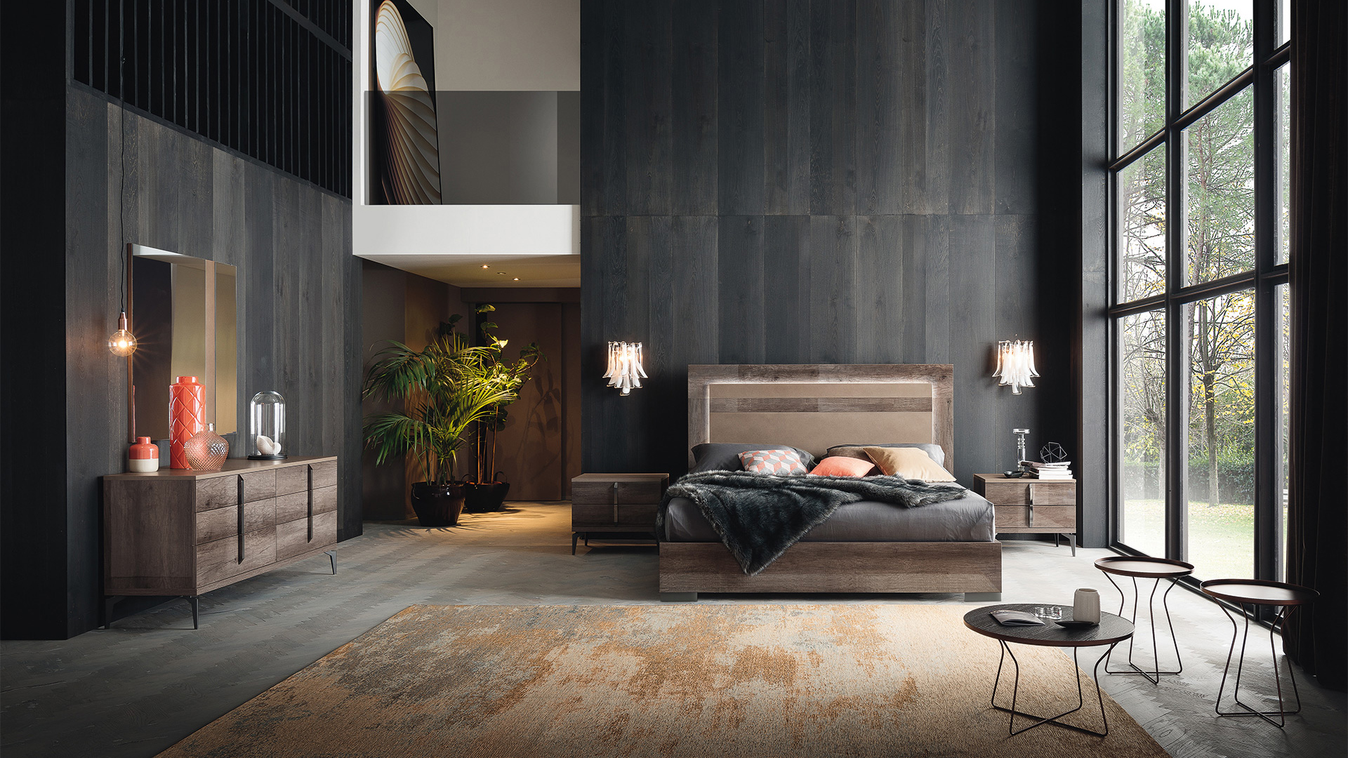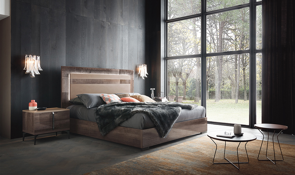 Спальня Alf Matera с серой кромкой с поверхностью из дуба / с поверхностью Grain. Особенности: современная кровать-платформа с системой освещения изголовья, механизм мягкого закрывания. Преимущество этого уникального и классически традиционного предмета состоит в том, что он имеет глянцевую отделку, которая добавляет теплоты и глубины и является идеальным дополнением к любой обстановке в спальне.