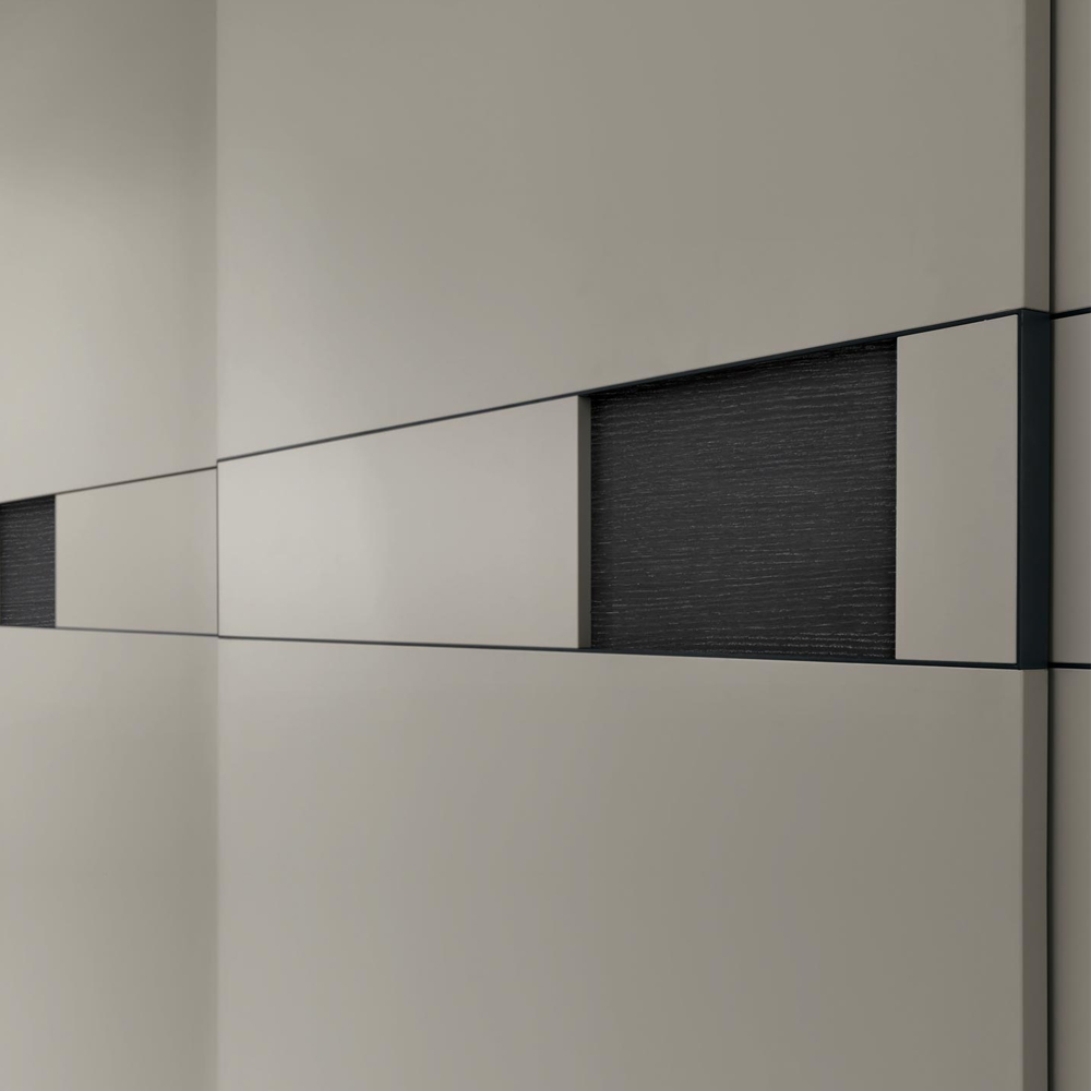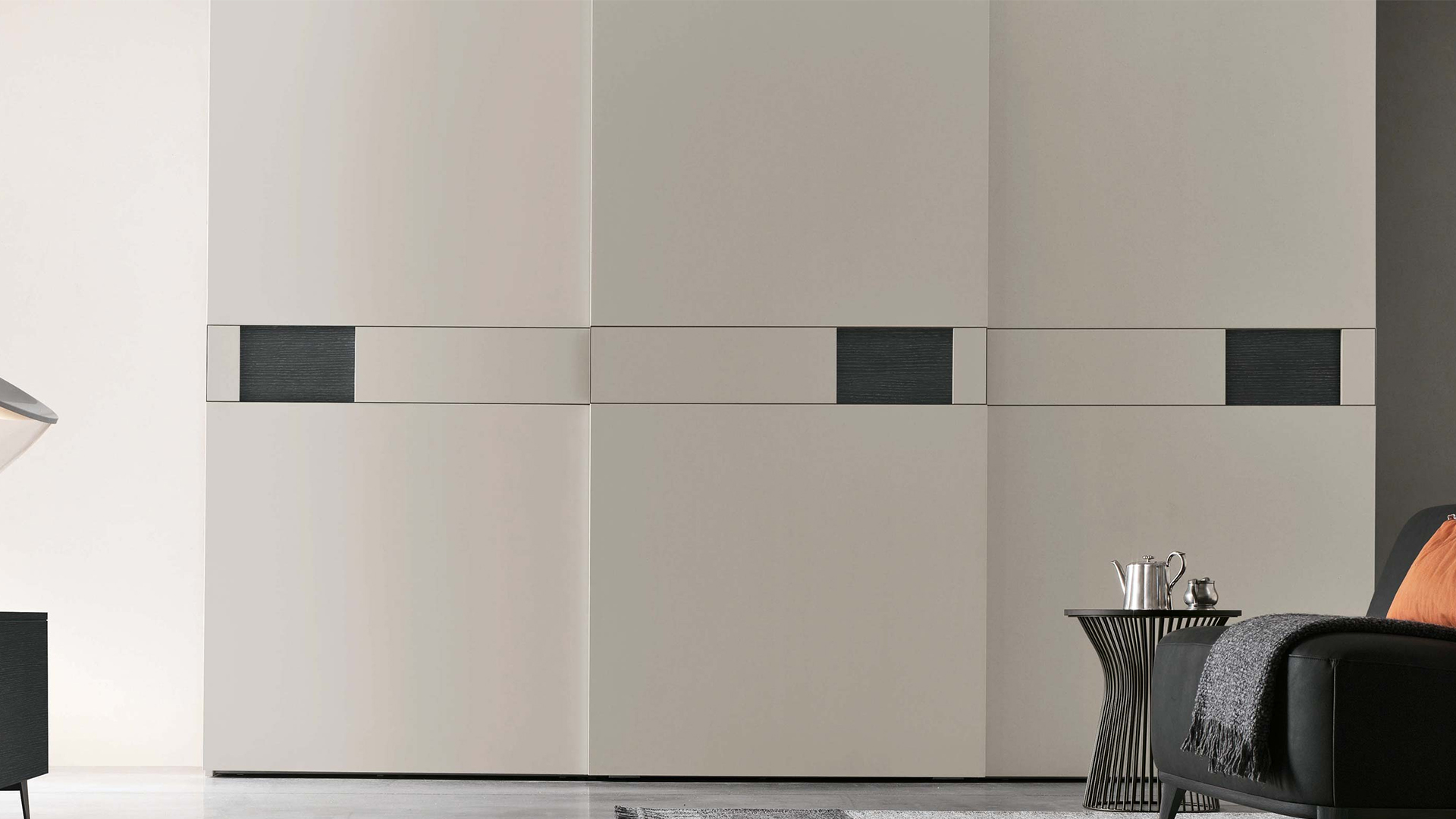 Шкаф с простыми геометрическими очертаниями украшают фактурные вставки, которые не только служат для декоративных целей, но и становятся захватом для удобного открытия раздвижной створки. Спальня становится просторной и стильной.